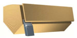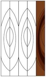 A half log is mounted with the heart side flat against the flitch table of the slicer. The cut is then made with the blade parallel to the length of the log producing the appearance of a “cathedral effect”.