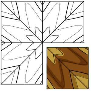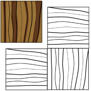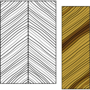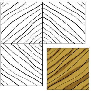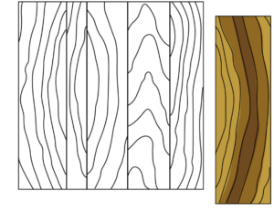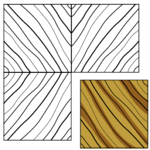 A quarter log is mounted on the flitch table so that the growth rings are perpendicular to the cutting blade, producing a series of stripes. These stripes can be straight in some woods and varies in others.