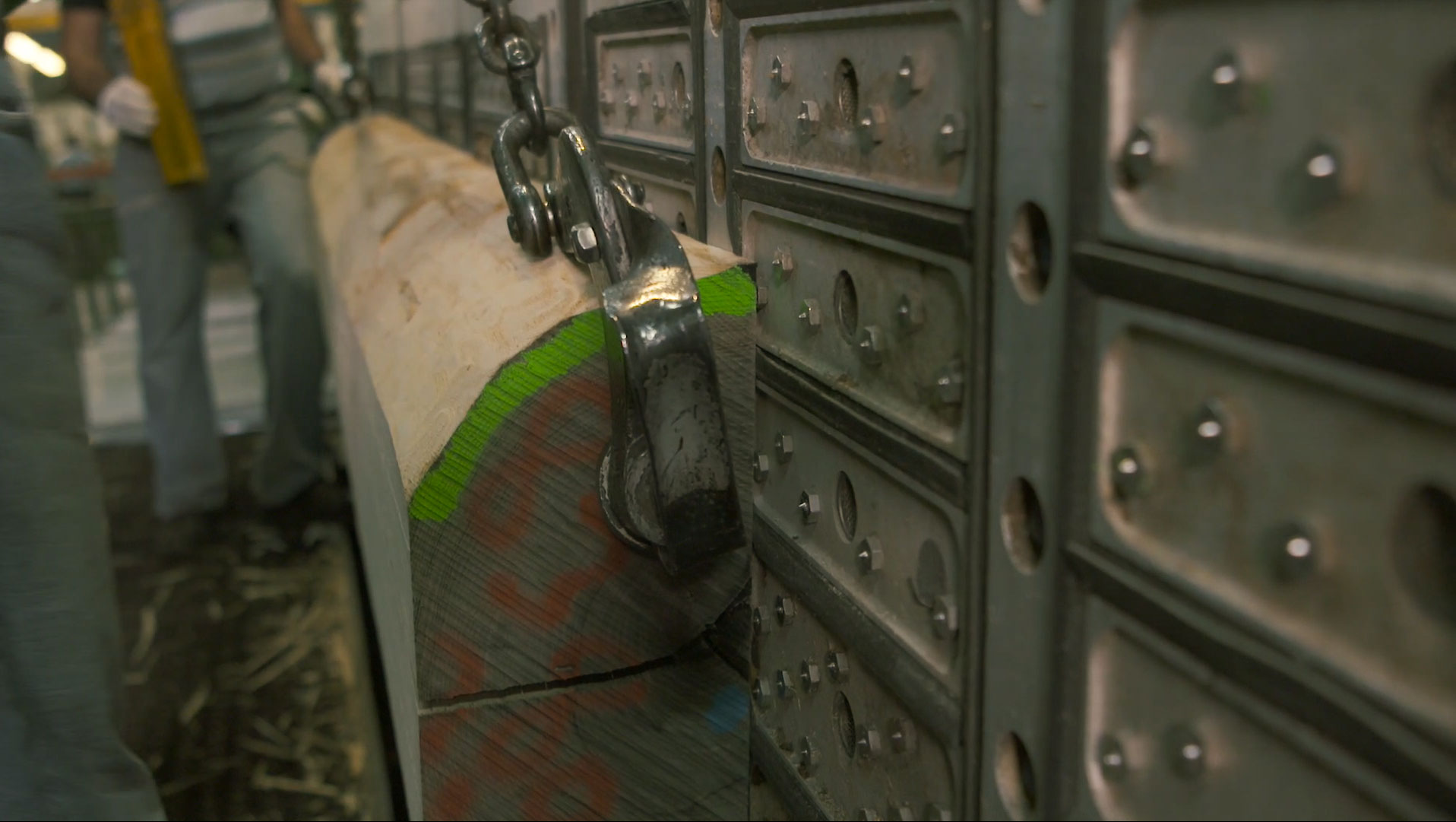 The logs undergo a lengthy soaking in hot water vats, softening the wood for easier slicing.